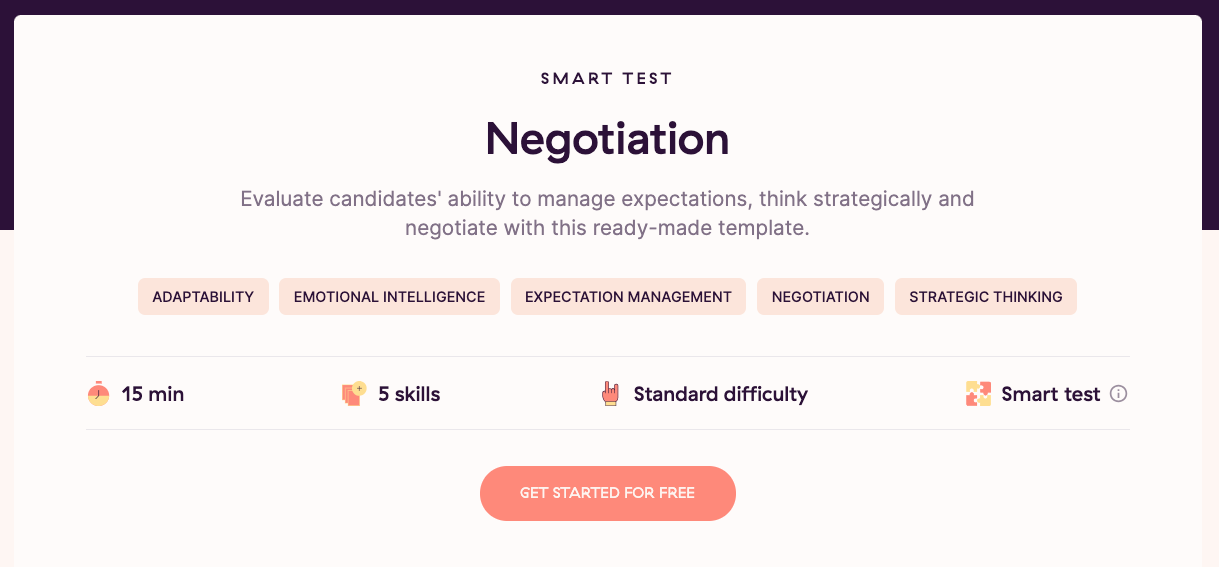 Our negotiation skills test is an excellent way to test one of the key areas of emotional intelligence. It’s one of the hundreds of tests you can find in our library of candidate assessment tests (that you can browse and sample for free!).