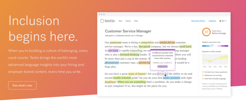 Tools such as Textio are perfect for this, using a Grammarly-style text editor to provide suggestions on ways to neutralize your job ads. Textio also focuses on aligning to your brand’s tone of voice, so you won’t lose your own identity in the process.
