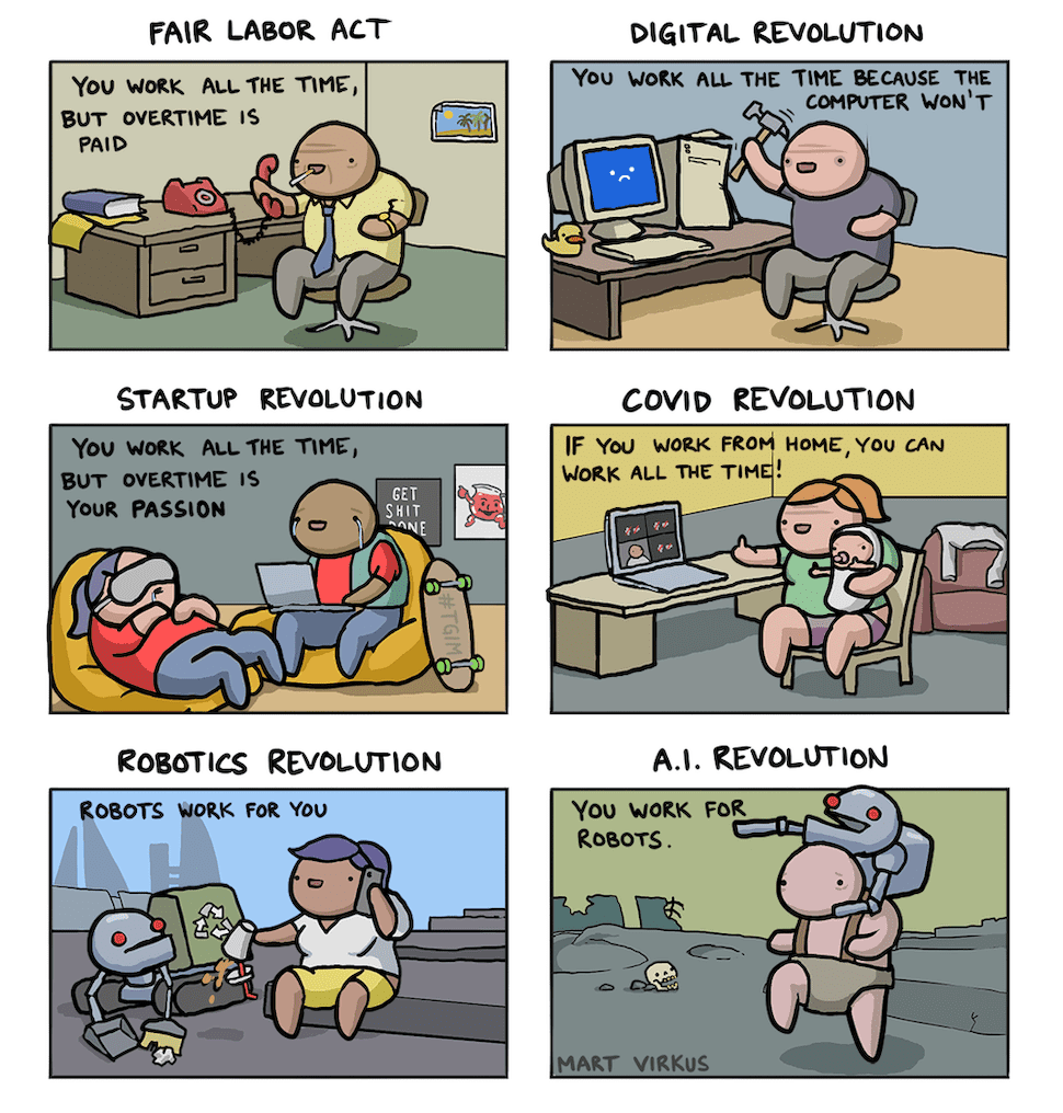 Humans have made dizzying progress over the past one hundred years, so it’s a little strange that we’re sneakily going back to the Industrial Revolution era exploitation where working 16 hours 6-days a week at a textile factory was a dope gig. If Robert Owen, an early industrialist and workers’ rights advocate, could see startuppers taking orders from a jar of cucumber water, he’d facepalm right through his skull.