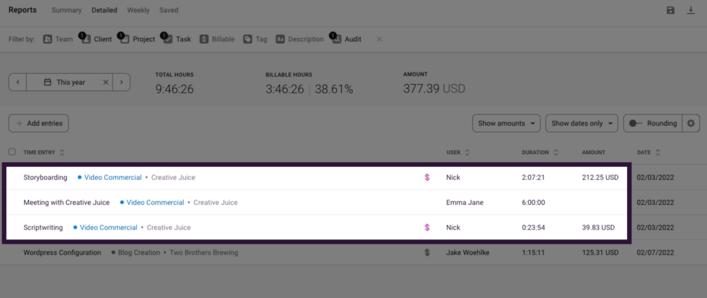 Using Toggl Track, you can view past project task data within the Reports Dashboard to better understand what time and costs went into each task.