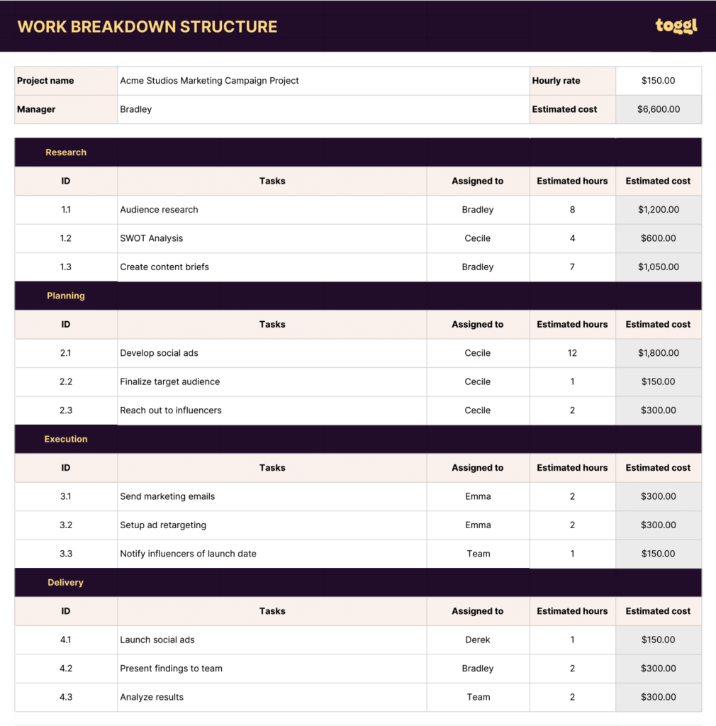 Create a detailed list of every project task (and what they cost) using a Work Breakdown Structure. It will help you create a far more accurate project budget.
