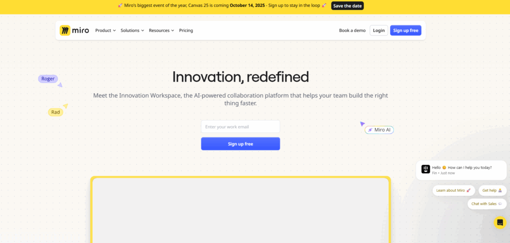 | Miro | $8+ | Yes, unlimited features | ✔️ Intelligent Canvas ✔️ Document Composer ✔️ MiroAI |