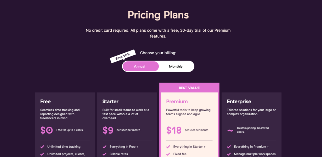 We recommend you start with the free, 30-day trial of Toggl Track Premium, and then stick with Premium after the trial if you’re using most of the features, or downgrade to the Starter Plan if not.