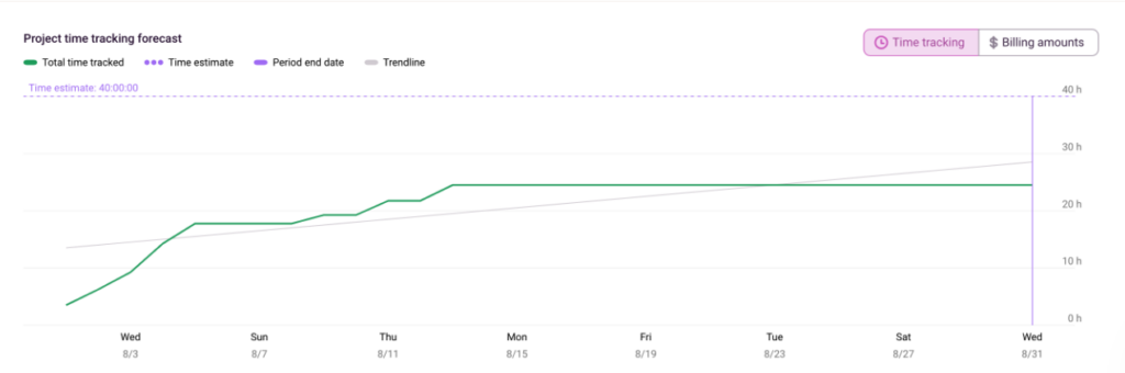 Once you or your team accurately tracks time against the project, you can use the Project Dashboard to track your progress against the project budget. You will get access to several charts. The Time Tracking Chart will show a forecast for project completion based on the project estimate and the hours clocked for that project so far.
