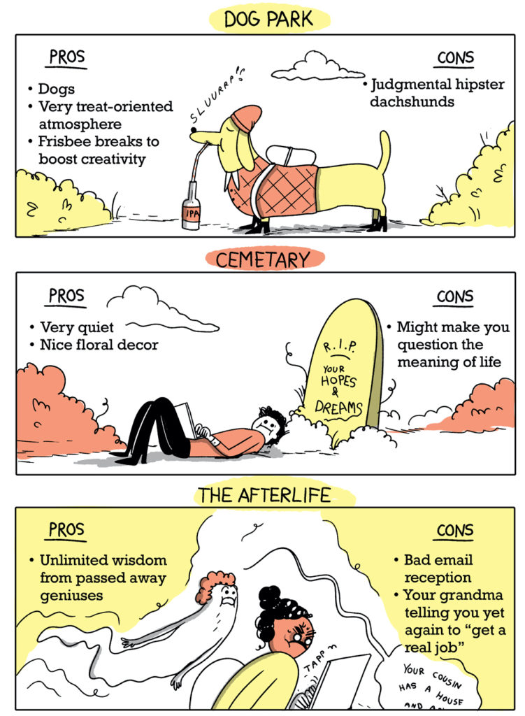 Some of these remote workspaces–such as the afterlife–might not personally appeal to you. Maybe the wisdom of the deceased is not enough to make up for the unsolicited advice from your grandma. Other remote workspaces–such as the bear cave–might expand your idea of the possibilities for remote workspaces.