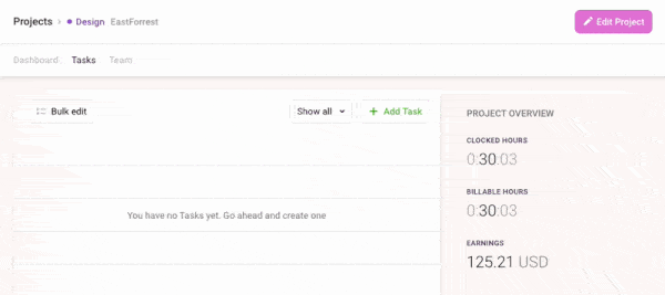 - Start tracking time for each project task via the ‘Tracker’ tab.